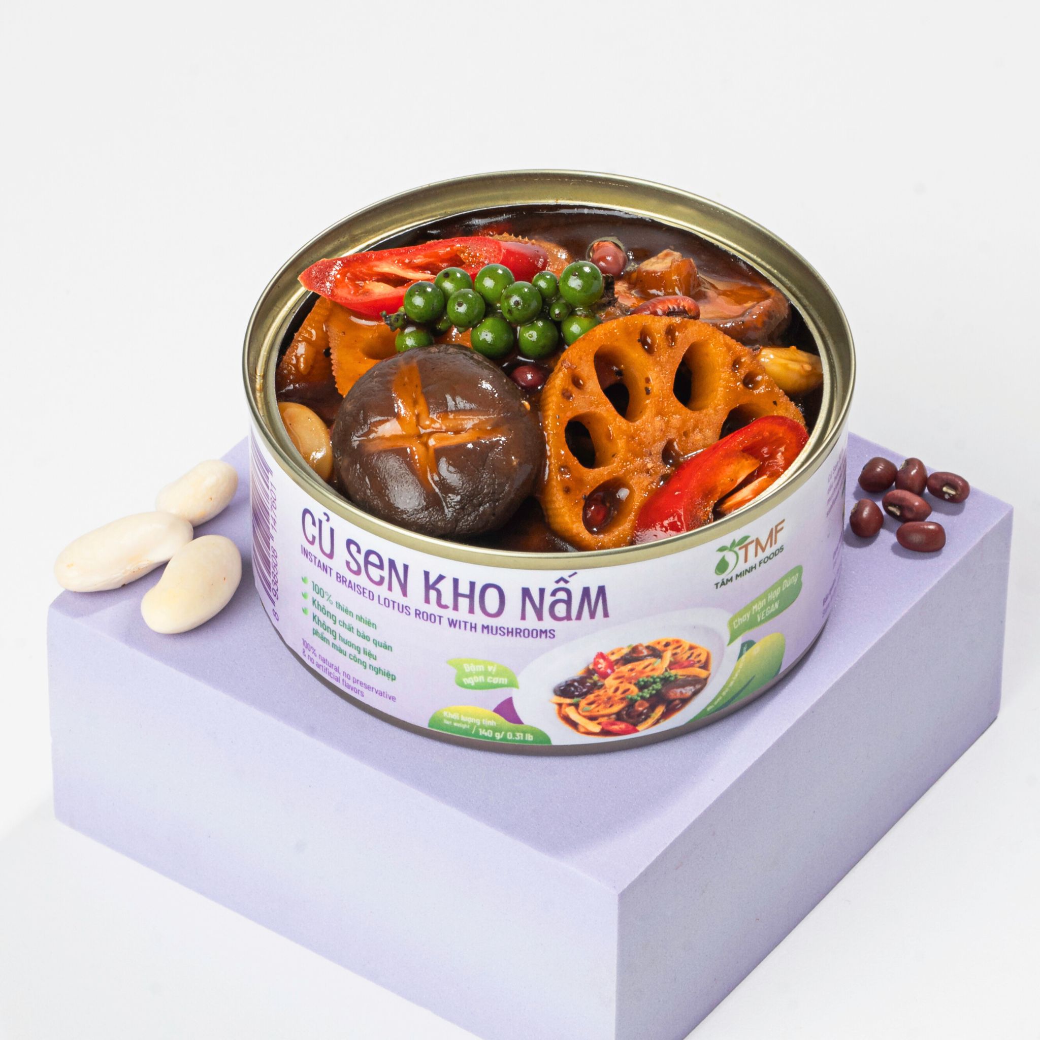 Tâm Minh Foods' Braised Lotus Root with Mushrooms is a nutrient-rich dish that combines the crisp sweetness of lotus root with the natural aroma of mushrooms. This product is high in fiber, vitamin B, and essential minerals, promoting heart health, supporting digestion, and offering a light, refreshing feeling. Braised Lotus Root with Mushrooms is an ideal choice for convenient meals without compromising on nutrition and natural flavors.