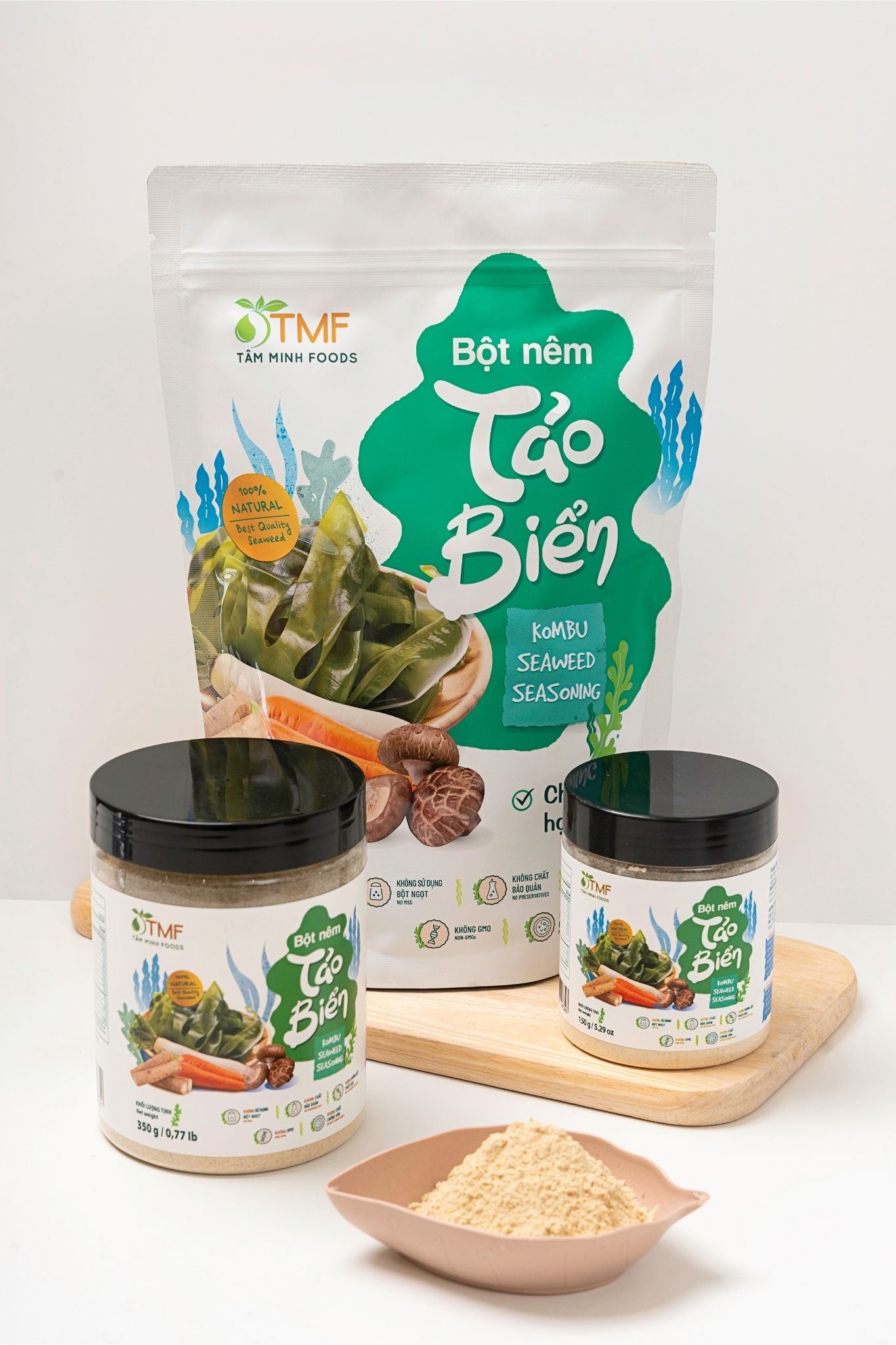 Seaweed Seasoning Powder contains 20% seaweed, providing a rich source of iodine, calcium, and magnesium for the body. The product does not use MSG or refined sugar. Instead, with the combination of miso and wheat germ along with burdock root, it creates a naturally mild and refreshing sweetness, helping to balance nutrition and enhance the flavor of dishes.